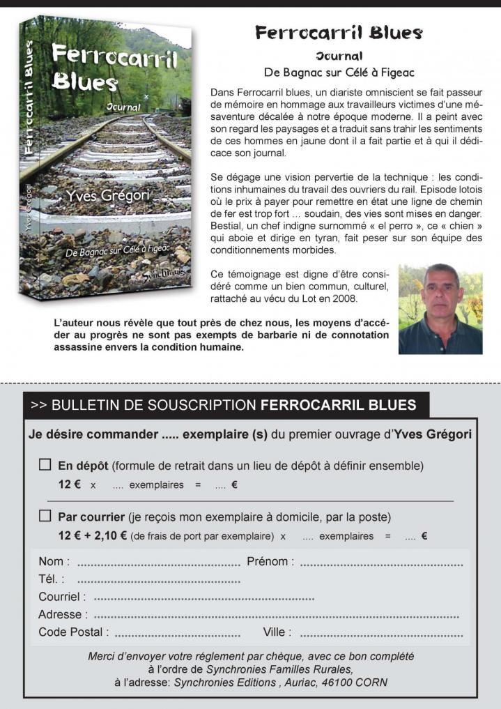 Avec Ferrocarril Blues, la toute jeune maison d'édition associative lotoise Synchronie colle à l'actualité. Yves Grégori nous livre un témoignage poignant sur ces hommes en jaune, ouvriers sur les voies ferrées du Lot, esclaves modernes victimes d'un système devenu fou, employés par une société espagnole qui sous-traite l'entretien des voies ferrées. Pour réaliser quelques économies, la SNCF externalise à tout va, sacrifiant la sécurité des voyageurs et les conditions de travail de ces forçats modernes sur l'autel du libéralisme. Un livre à lire et à offrir sans retenue aucune, au moment où l'enquête sur l'accident de Brétigny révèle les dérives de l'opérateur national.